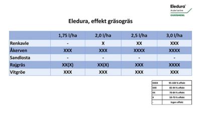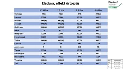 Eledura visar god effekt mot en rad vanliga gräs- och örtogräs såsom vitgröe, åkerven, blåklint, veronika, våtarv, viol, lomme, snärjmåra, plister och näva. För detaljerad information om effekt mot specifika ogräsarter, se tabellerna nedan.