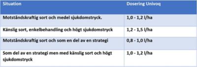 Detta gör att risken för resistensutveckling ökar och Jordbruksverket bekräftar nu ett antal fall av SDHI-resistenta stammar av Zymoseptoria tritici (svartpricksjuka) i Sverige vilket gör Univoq till ett mycket välkommet tillskott. Nu kan resistenshantering tas i beaktande då strategin för svampbehandling planeras, växla aktiva substanser mellan år, mellan fält och inom strategier.