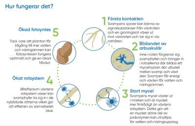 Svampen tar sig in i roten och etablerar ett symbiotiskt förhållande, vilket “utökar” rotsystemet, och förbättrar närings- och vattenupptaget från jorden, vilket ökar avkastningspotentialen.