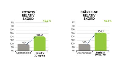 Sammanställning av tre års försök, 2022-2024, utfört av Lyckeby. Resid G ökar både skörd i ton samt stärkelseskörd.